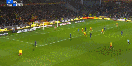 第45+1分钟,乌敦左路传球门后点,阿吉拉尔端射破门,朗斯1-0勒阿弗尔。