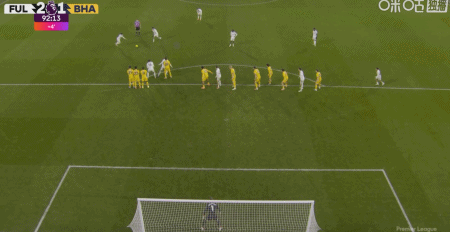 第90+2分钟,哈里-威尔逊任意球直接破门,富勒姆2-1布莱顿。