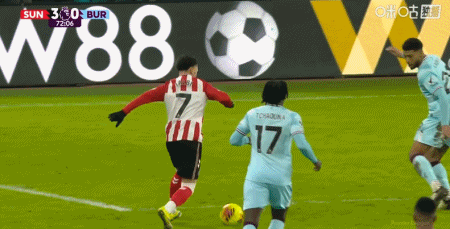 第9分钟,迪亚拉射门打在图安泽贝腿上折射入网,桑德兰1-0。