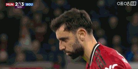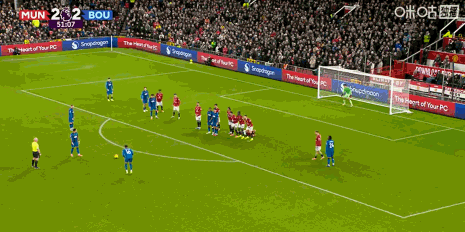 第77分钟,任意球对轰,B费将球送入死角,曼联3-3。
